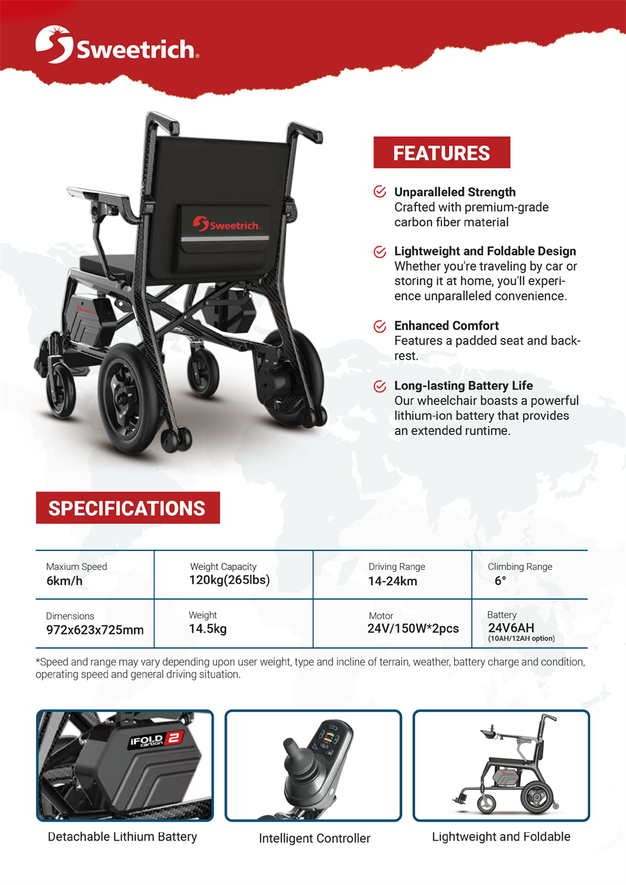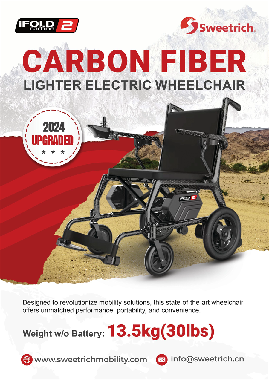 Najnowsza ulepszona wersja wózka inwalidzkiego Sweetrich ma wzmocnioną konfiguracje i pojemność obciążenia, co czyni go najlepszym wyborem dla lekkiego, składanego wózka inwalidzkiego, który można przyjmować na samolotach. Jego lekka i składana konstrukcja zapewnia niezrównaną wygodę, niezależnie od tego, czy podróżujesz samochodem, czy przechowujesz go w domu. Ifold Carbon2 jest wytwarzany za pomocą materiałów z włókna węglowego klasy premium. Ten wózek inwalidzki ma stosunkowo duże Pojemność obciążenia 120 kg i jest wyposażona w dwa silniki 150 W, zapewniając dużą moc. Oferuje wybór długotrwałej żywotności baterii od akumulatorów litowych od 6ah do 10AH, zapewniając silną wytrzymałość. Ifold Carbon2 jest wyposażony w akumulatory litowe zatwierdzone przez linię, umożliwiając użytkownikom przyjmowanie go na samoloty, zapewniając im wygodę.
